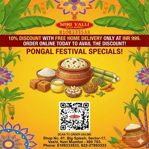 Get ready for Pongal with our all-inclusive festival pack! Includes 1kg Pongal Rice, 1kg Jaggery, Fresh Turmeric & Ginger Bunches, Full Sugarcane, Ghee, Dry Fruits, Small Onions, and Mixed Tubers. Fresh, authentic, and delivered to your home.